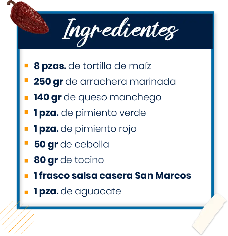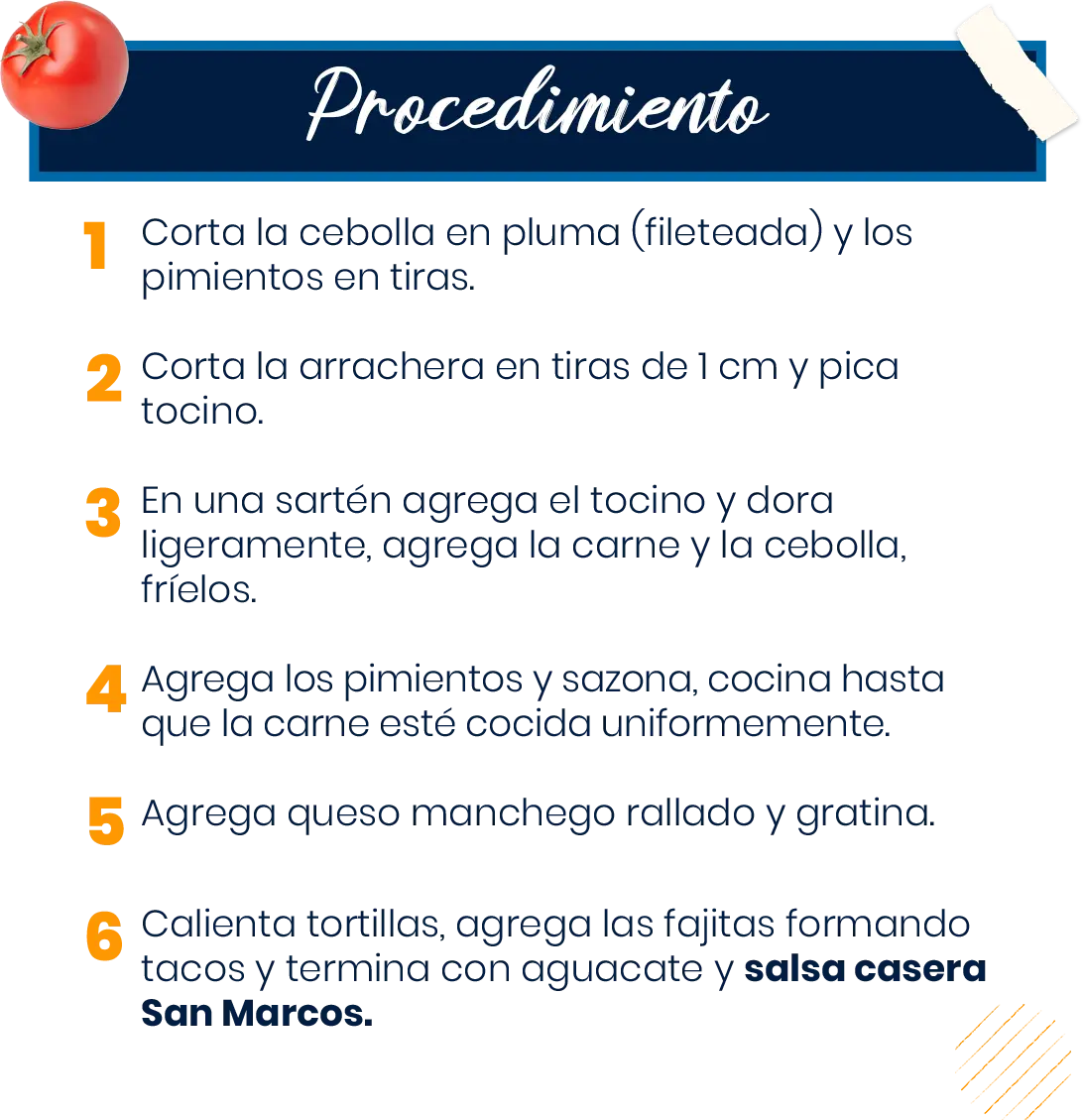 Calienta tortillas, agrega las fajitas formando tacos y termina con aguacate y