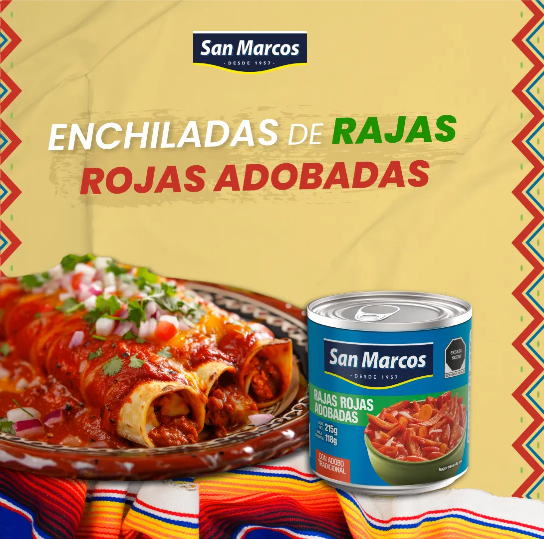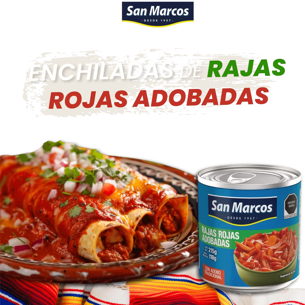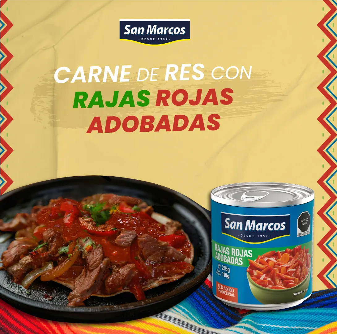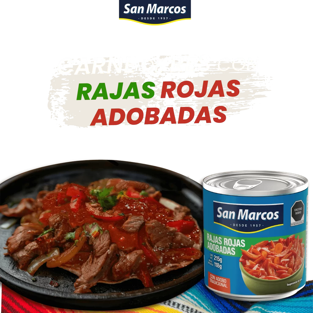 2. En una sartén, vierte una lata de rajas rojas adobadas San Marcos, machaca un poco y deja cocinar unos minutos hasta que hierva.