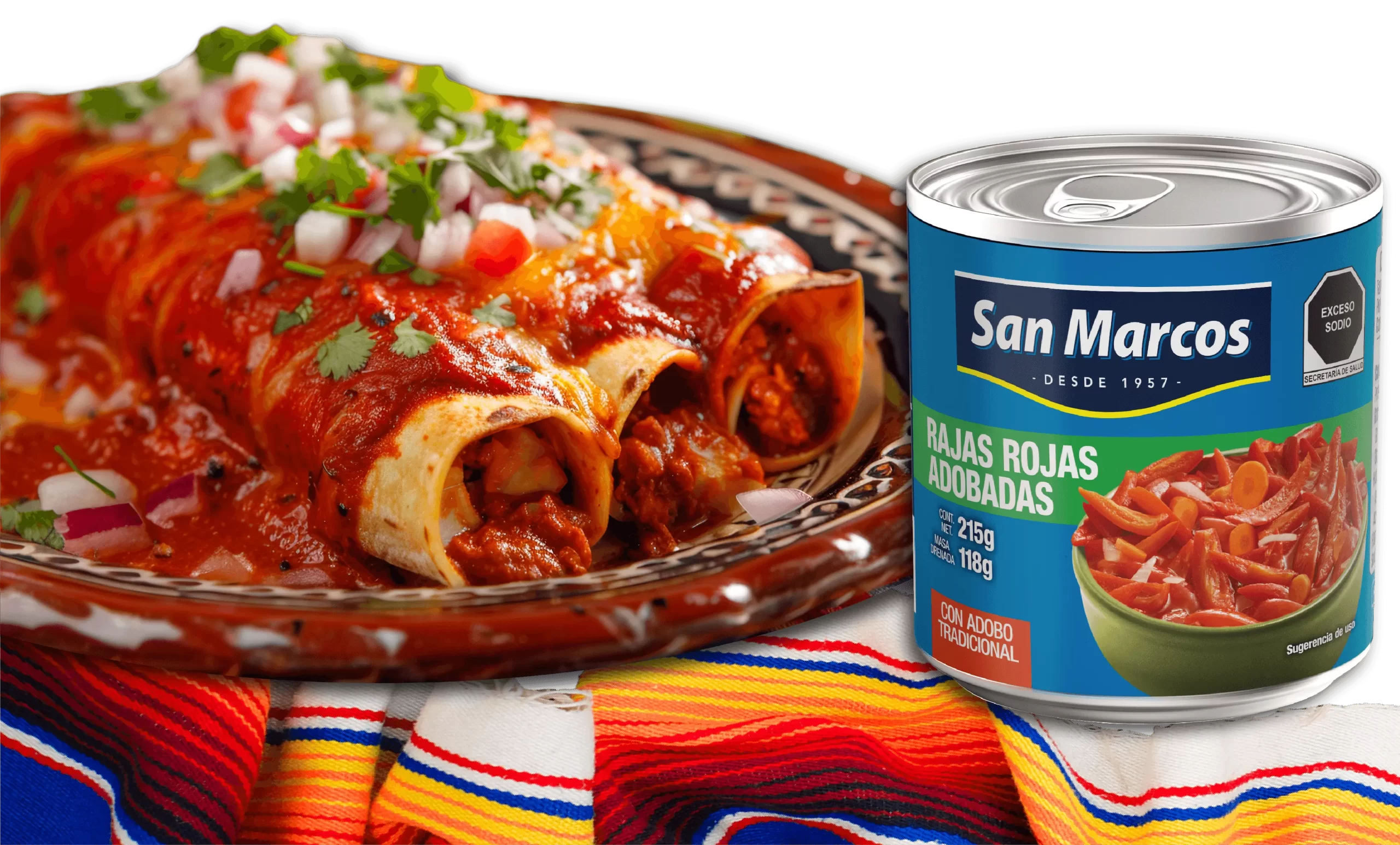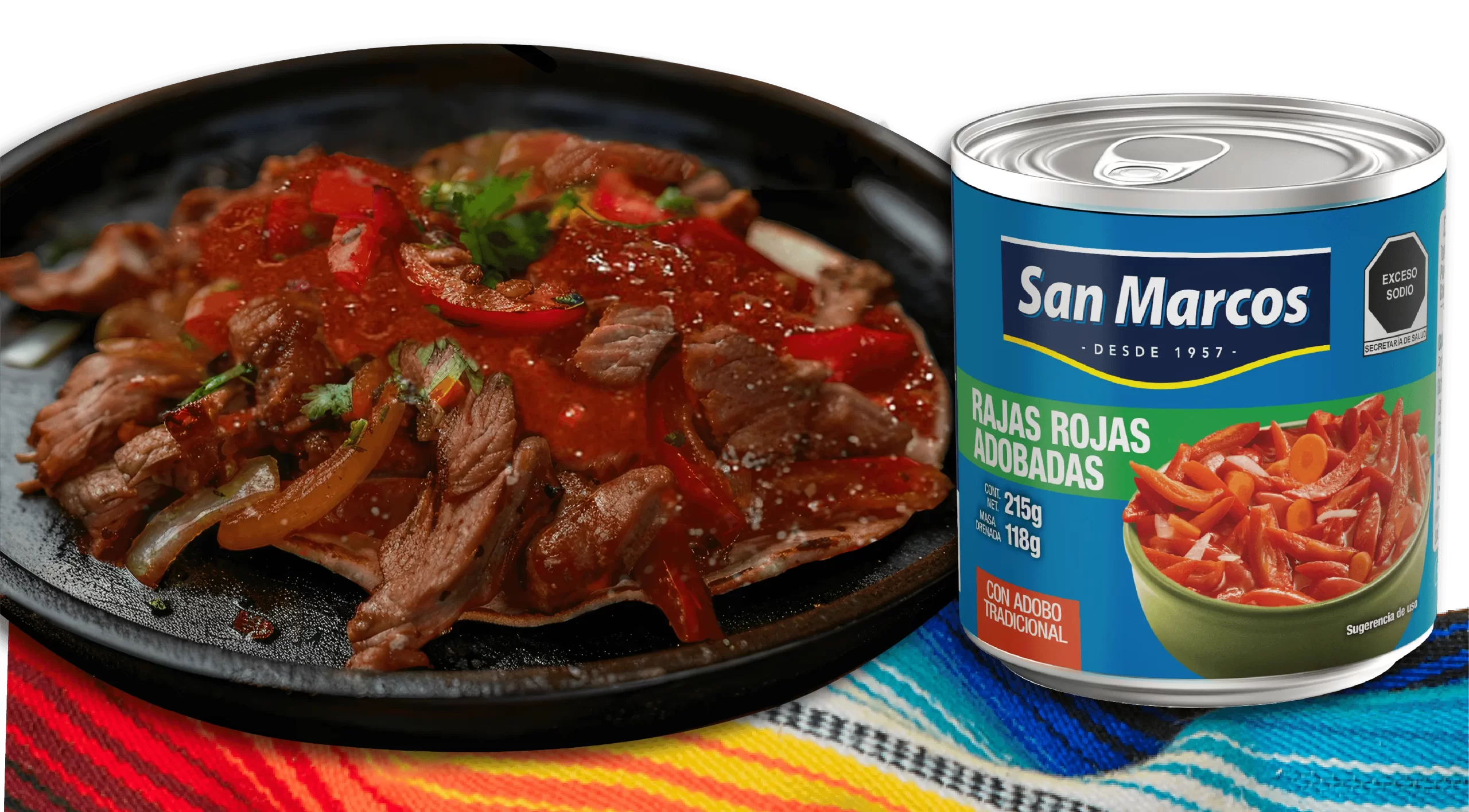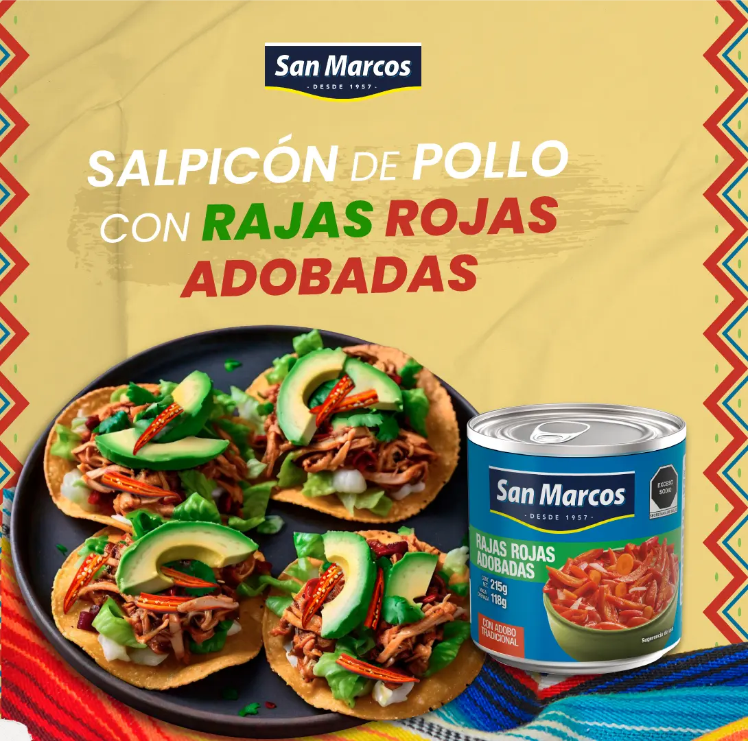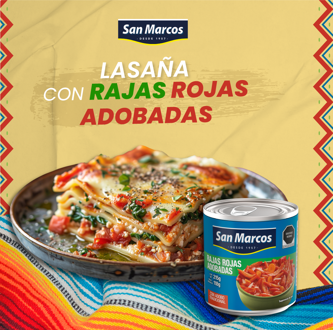 2. En una sartén, vierte una lata de rajas rojas adobadas San Marcos, machaca un poco y deja cocinar unos minutos hasta que hierva.