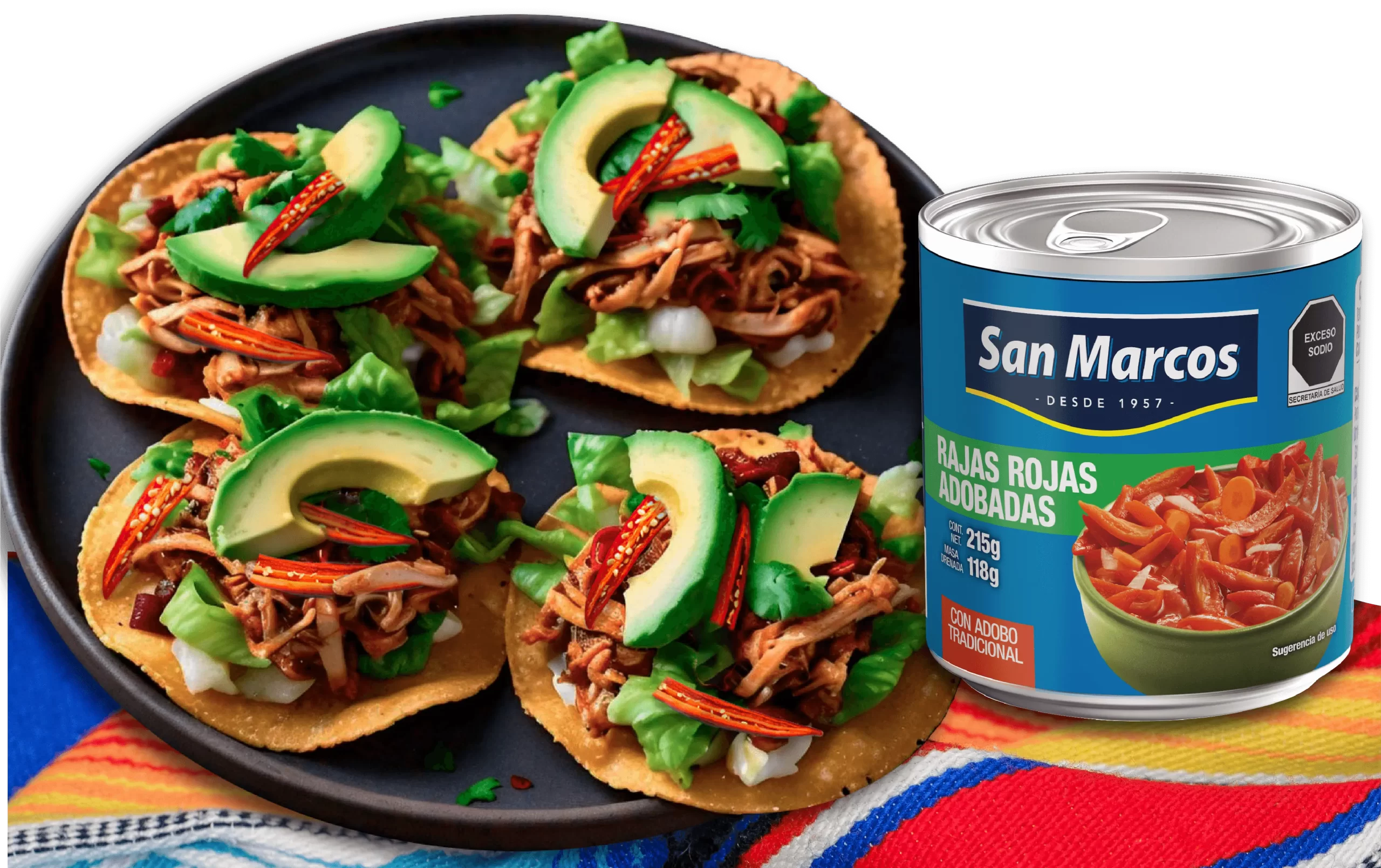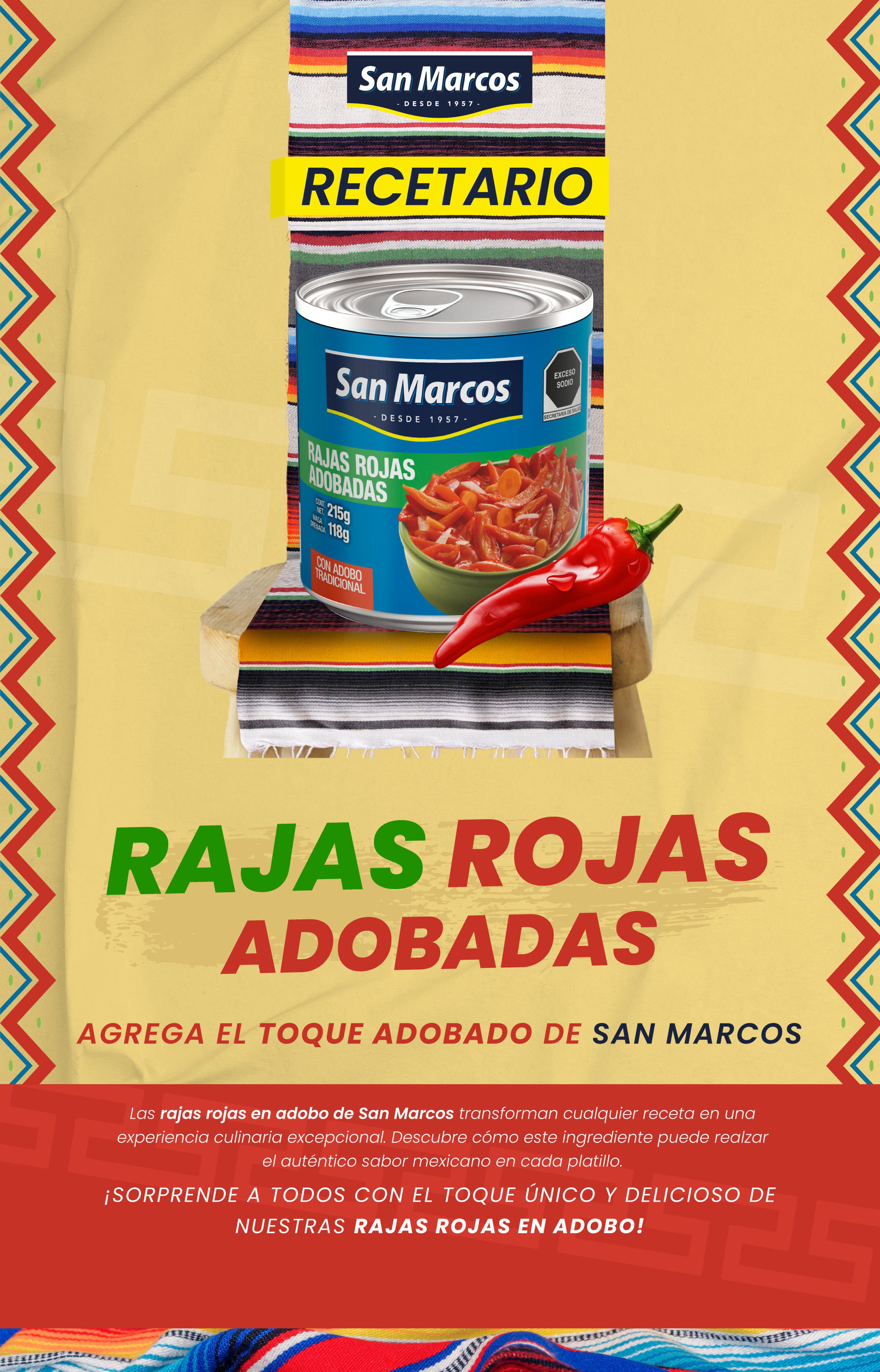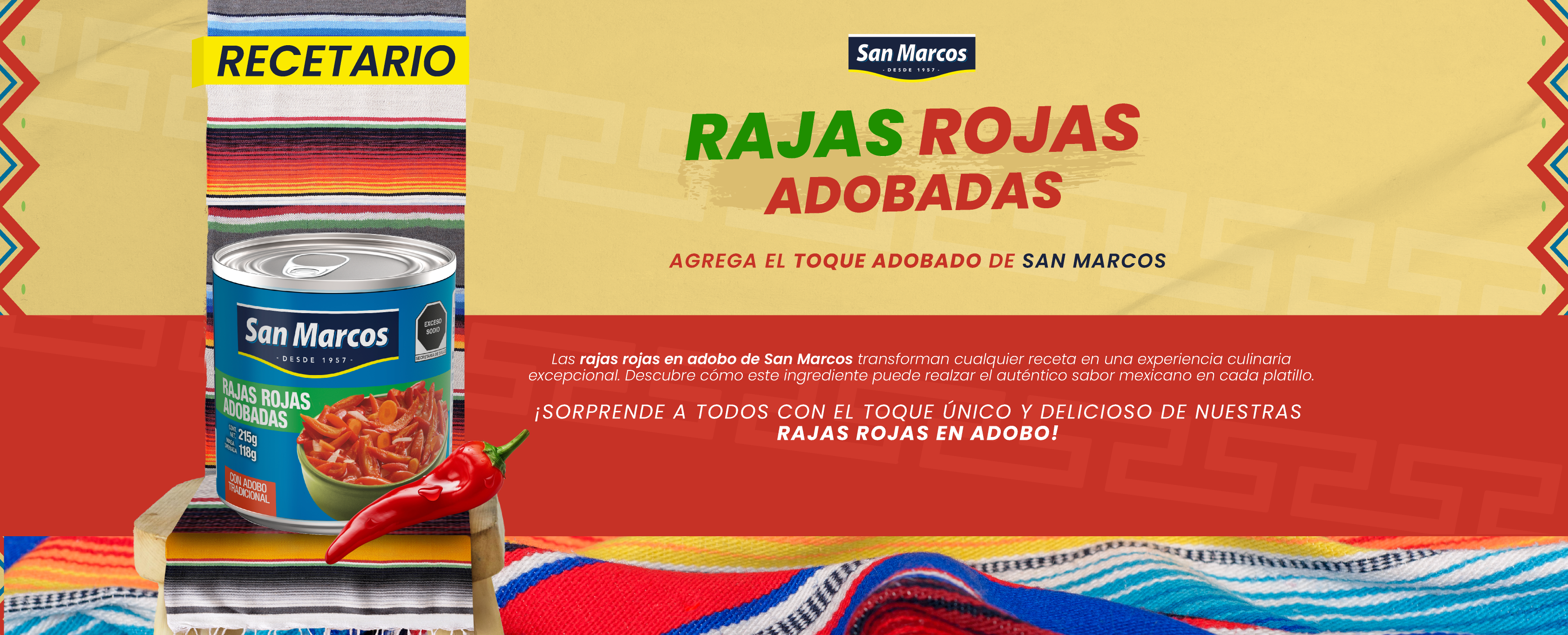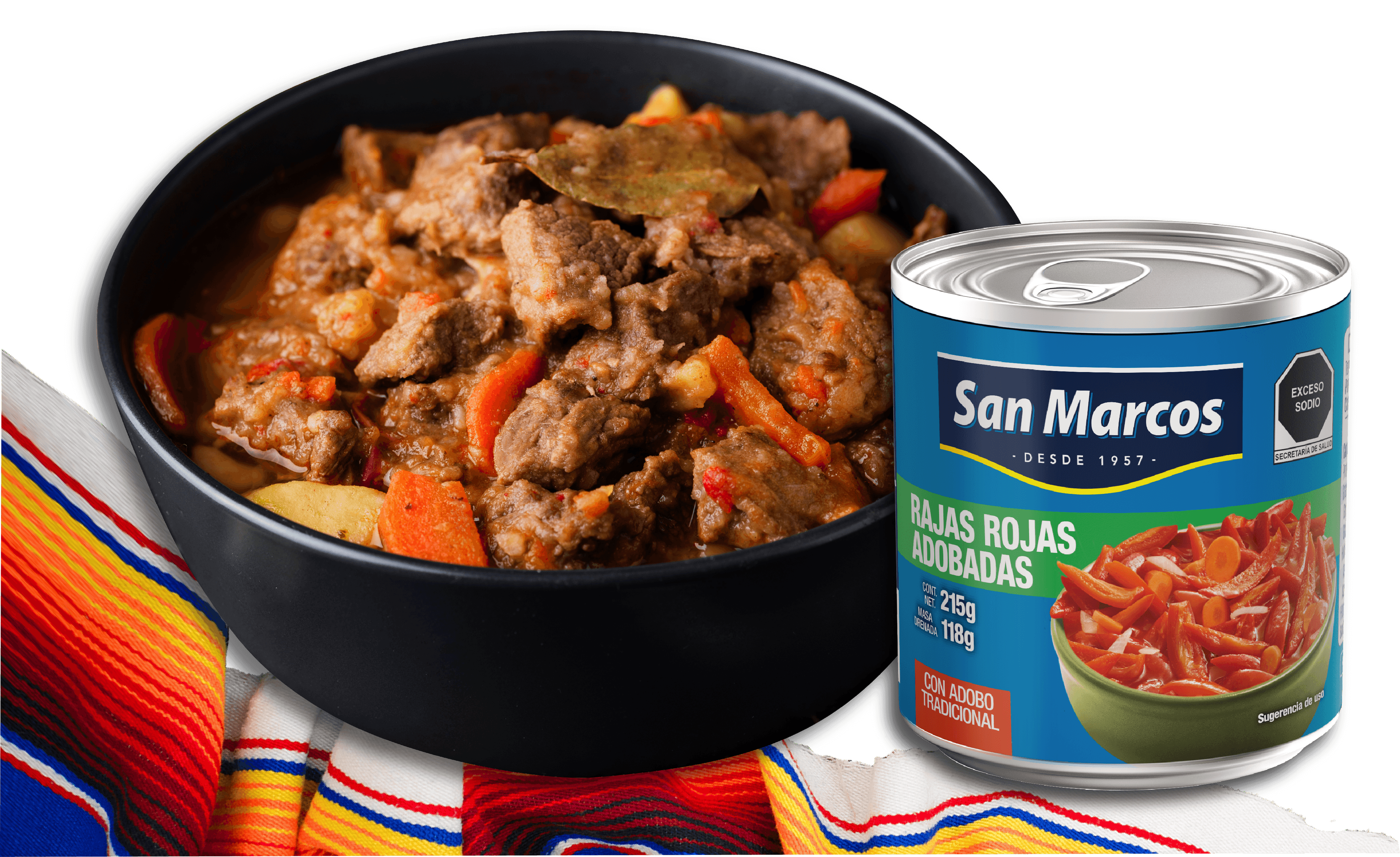 2. En una sartén, vierte una lata de rajas rojas adobadas San Marcos, machaca un poco y deja cocinar unos minutos hasta que hierva.