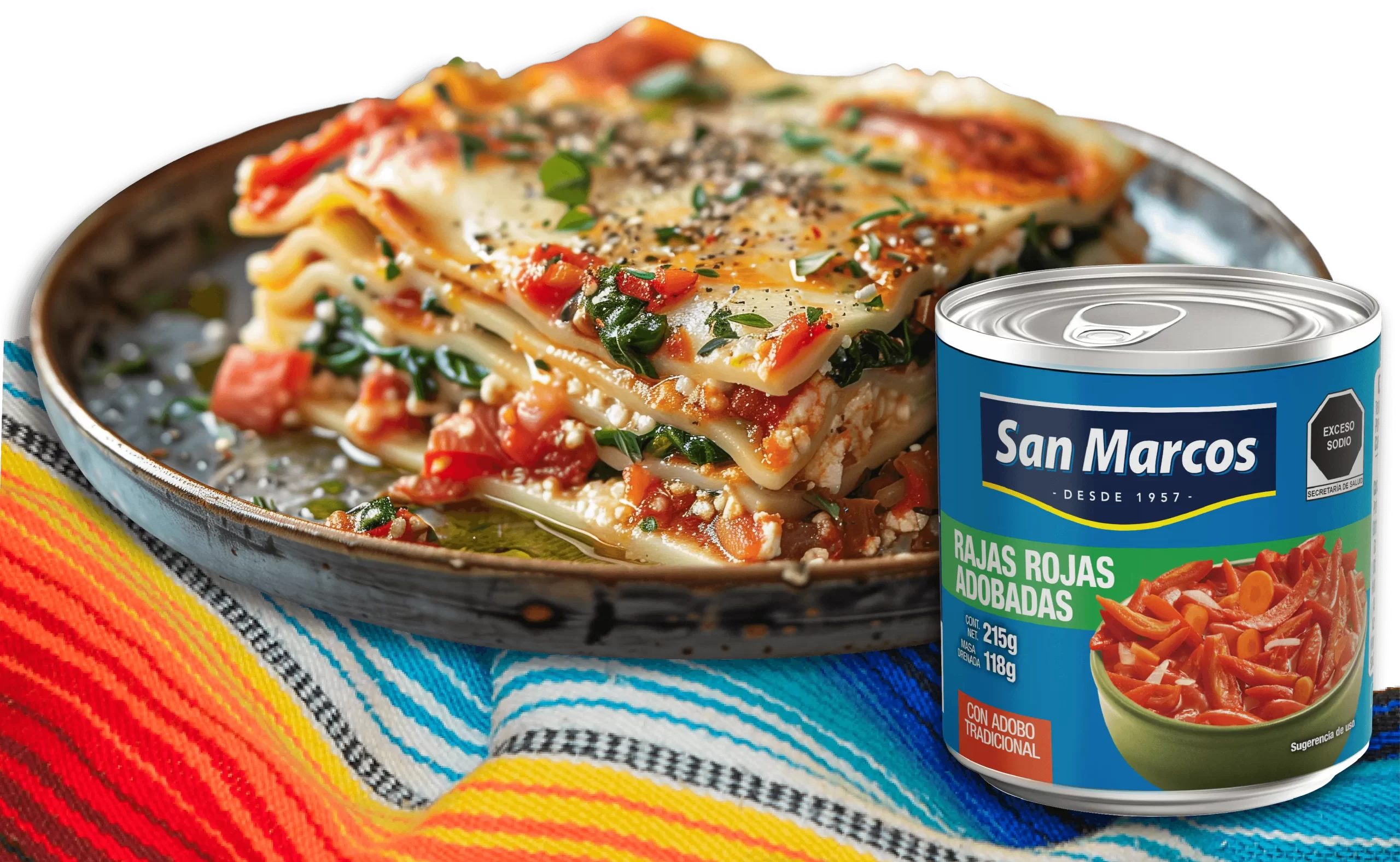 4. En un refractario de horno pon un poco de la salsa de jitomate con rajas rojas adobadas San Marcos y coloca 3 placas de lasaña. Reparte el sofrito y espolvorea con orégano, coloca más pasta. Repite hasta terminar las placas de lasaña.